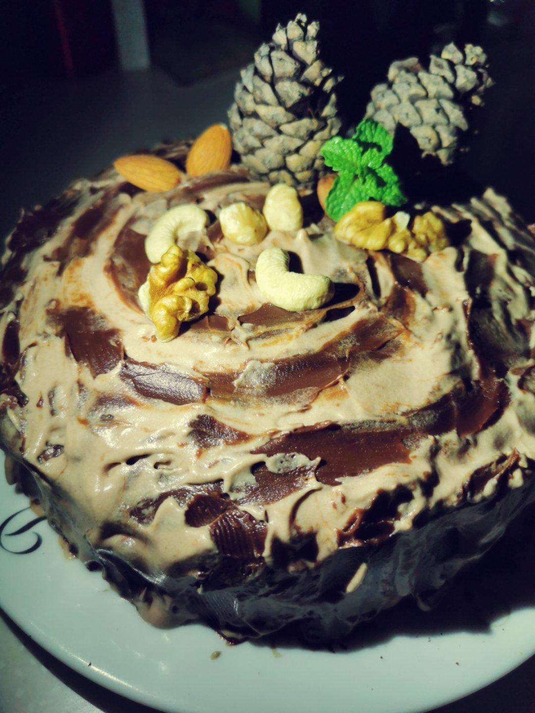 基本按方子来的,抹面稍有改动,巧克力多了些,没有放可可粉,奶酪略加了点盐,和部分巧克力混合,剩下巧克力奶油涂成树桩,巧克...