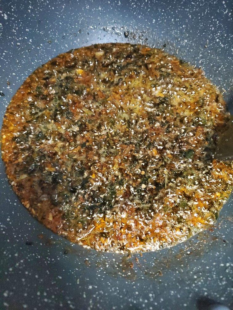 家里没有萝卜干,放了香菇,懒得切辣椒,就放了重庆带回的辣椒面,在盒马买的紫苏叶子,盒马说明上写紫苏配海鲜好吃,我就放了点...