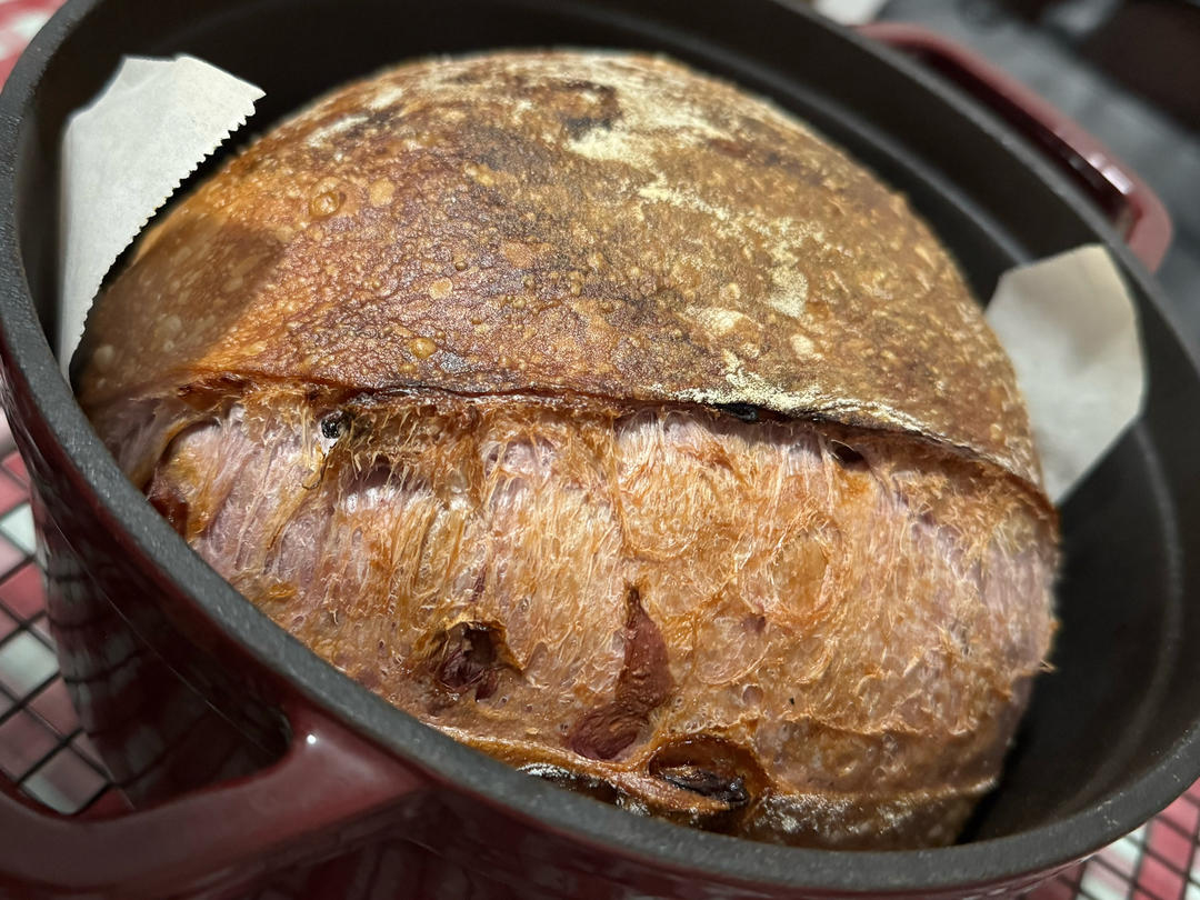 怎么不是一种高效率呢~~~4倍三盘,加了一坨老面和烫种,190℃,24min。很好,好吃极了,分了一部分面团做开心果贝果...