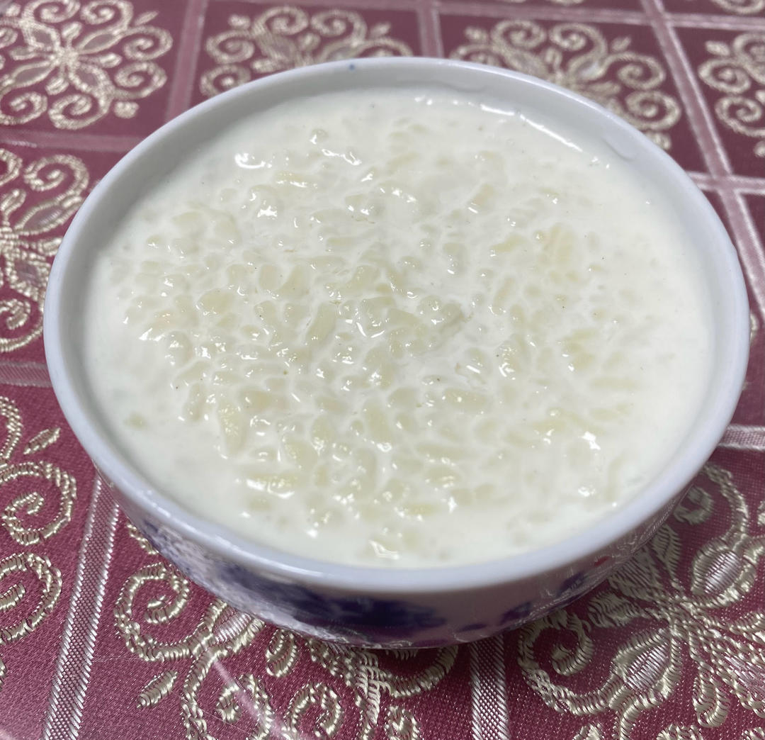 最简单的米布丁:米饭、鲜(椰)奶、(奶油、)糖,小火搅拌10-15分钟,放凉冷藏
