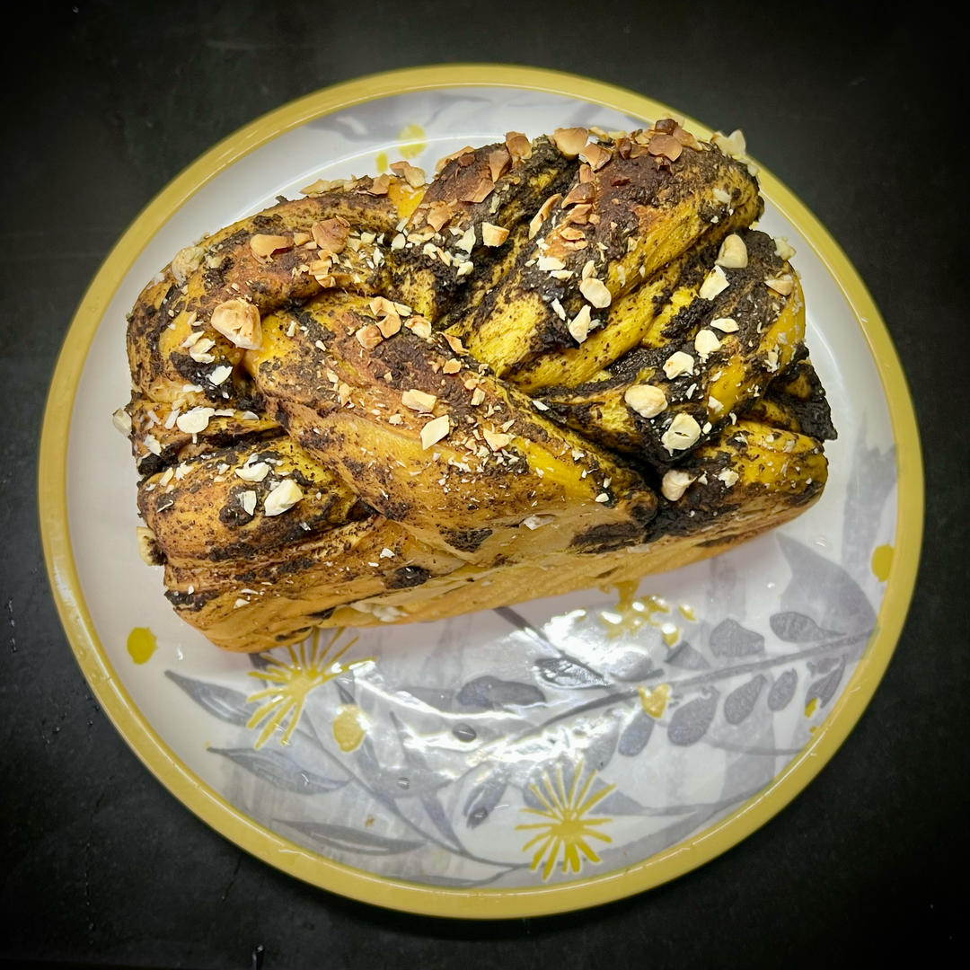 黑金大块头!早上做南瓜慕斯多出来的酸奶南瓜糊,正好揉吐司面团(还加了一点点姜黄粉)。不想用黄油做夹馅...