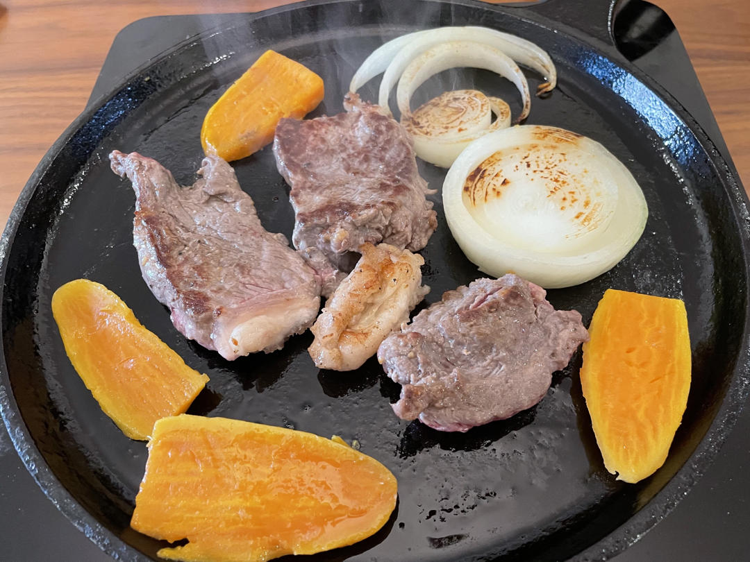 牛肉切厚片,两面用盐和黑胡椒腌制一会。先两面烤到变色,在用剪刀剪成小块烤到理想熟度