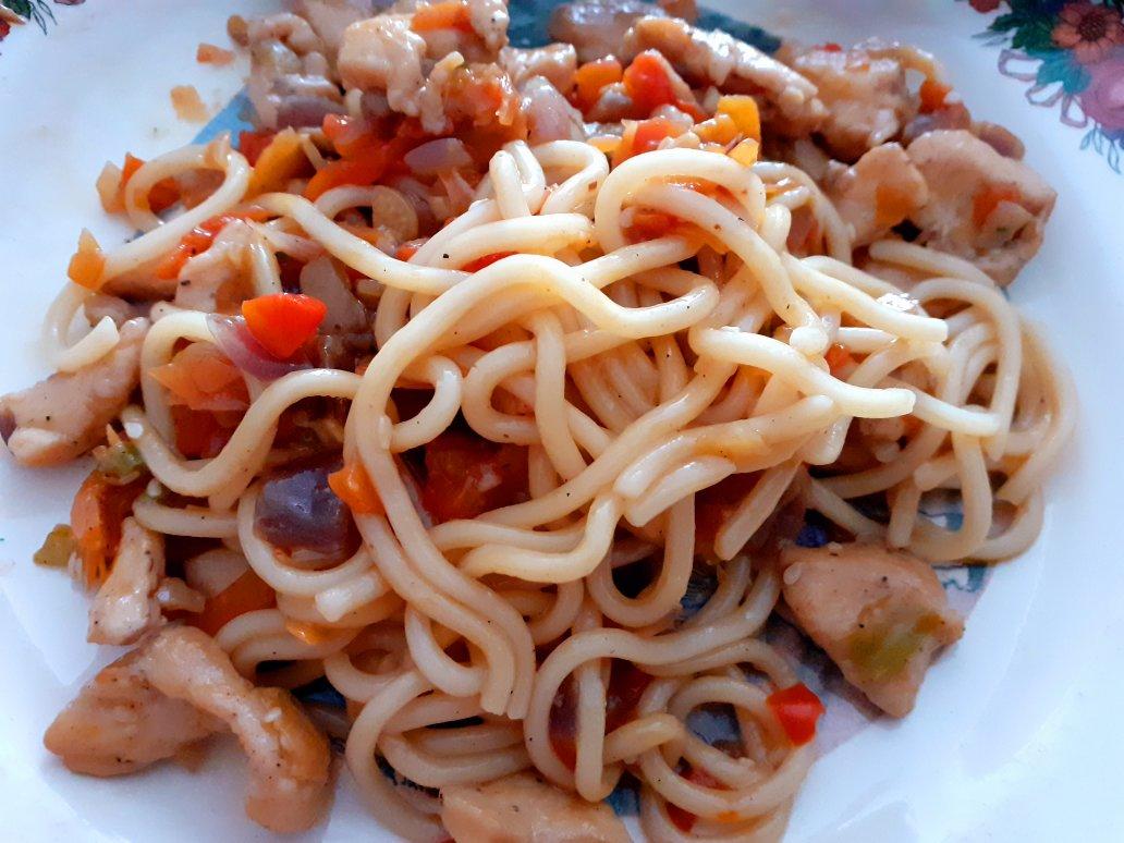 今晚本想做个鸡胸肉盖饭的,但是后来时间紧张干脆就做个面,煮得半熟后放进锅中和蔬菜一起小火...