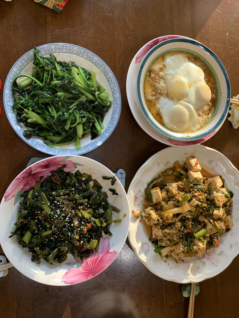 肉饼蒸蛋,麻婆豆腐,酸辣羽衣甘蓝,清炒时蔬