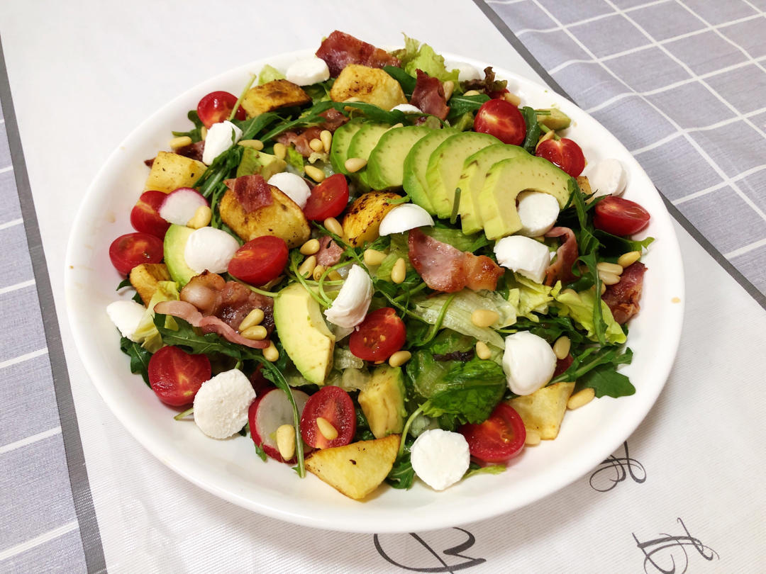 牛油果培根蔬菜沙拉配马苏里拉奶酪球