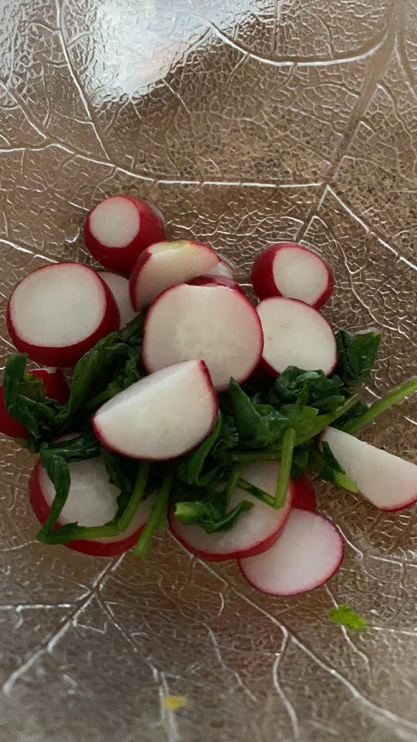 意外的好吃。萝卜叶用开水烫了下,小萝卜切片,拌上几滴香油几滴意大利醋。很久不用香油,脑子...
