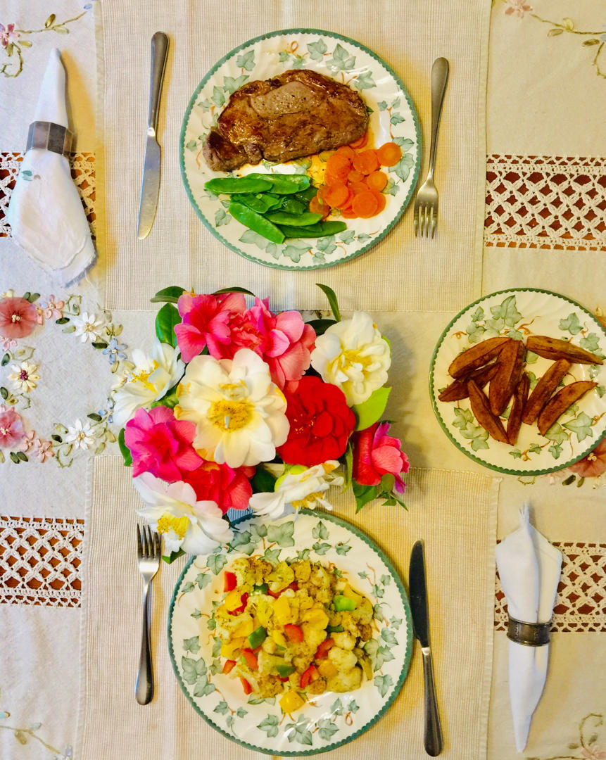 下了一天的雨,完全沒有活動量。我的乾烤菜花和先生的西冷牛扒。