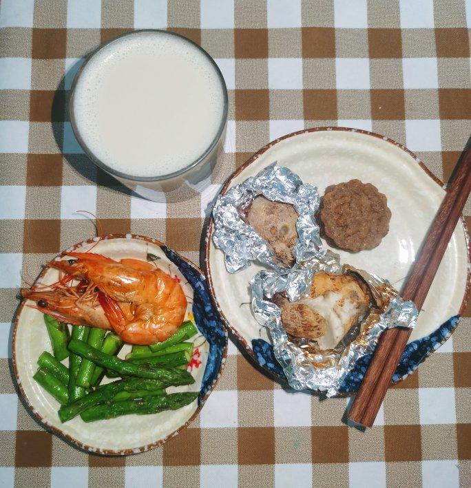 烤芋头+大明虾+八珍糕+杂豆豆浆+芦笋