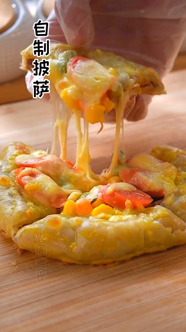 自制披萨,在家里自己就可以做,喜欢什么口味,自己就加什么水果,加榴莲,香气能飘到隔壁小孩家。