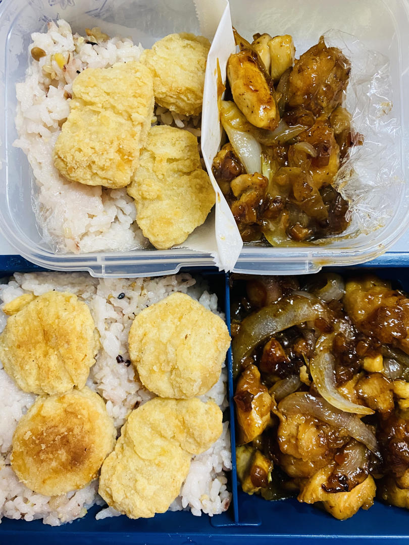 今天的午餐便当。油淋鸡风味,还用烤箱烤了鸡块!