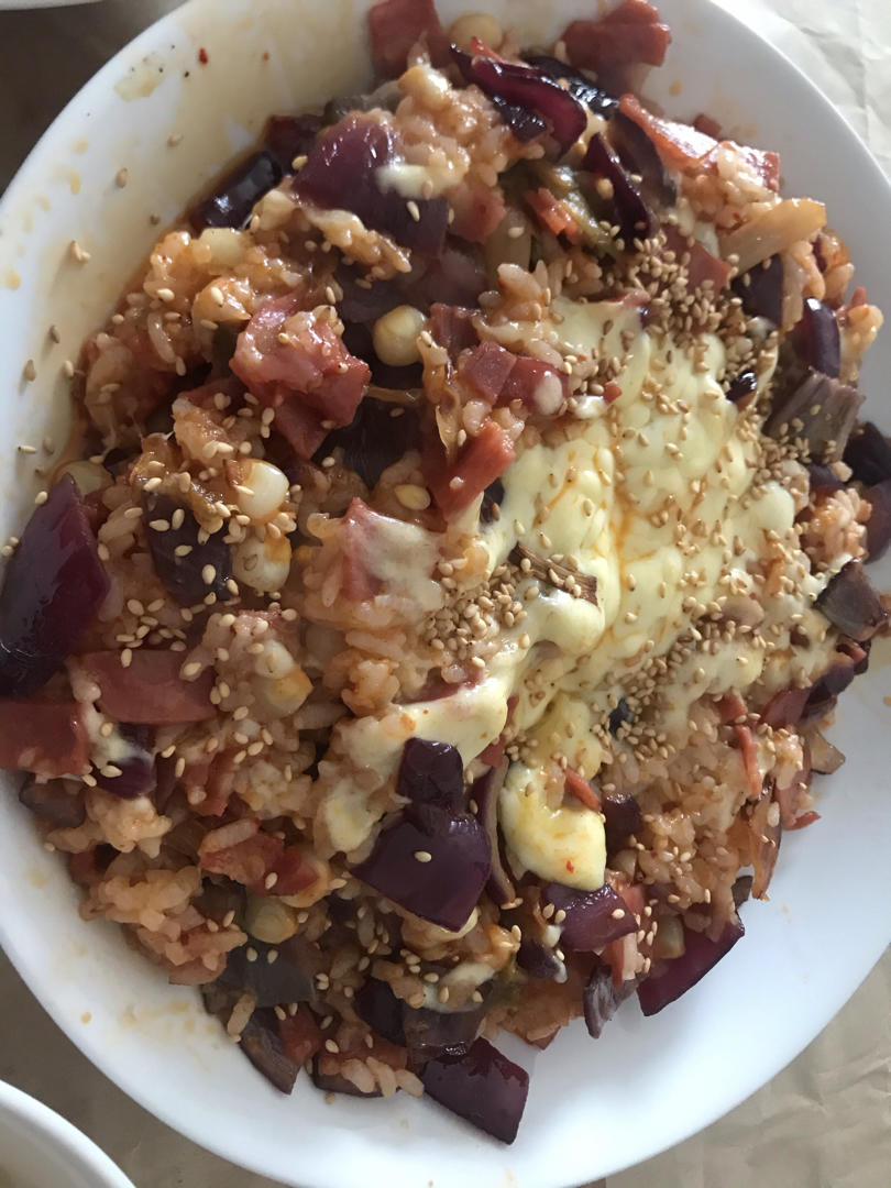 因为有辣白菜,味道酸酸的,不太喜欢,里面还加入了玉米粒,很好吃,应该多加些,没有海苔,用芝...