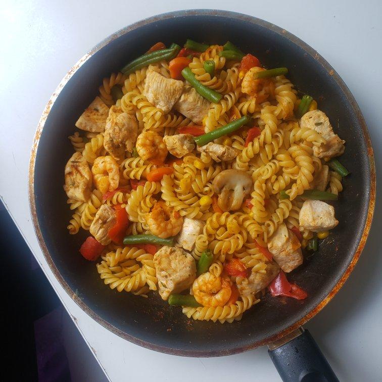 用铁锅炒的,好久不用掉色啦,想哭😭哈哈,味道可以,但是菜谱没有辣,我放了三根小米辣,非常好...