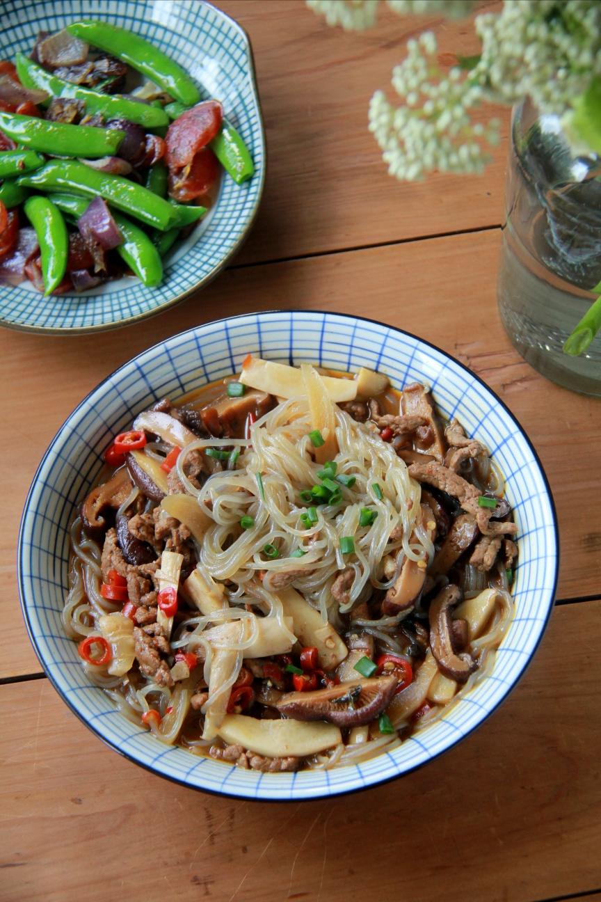 杏鲍菇和香菇代替松蘑,牛肉代替猪肉,擅自做主加了泡椒,和红薯粉丝一起吃真是酸辣爽口啊,有了红薯粉丝当主食就没煮米饭了,后...