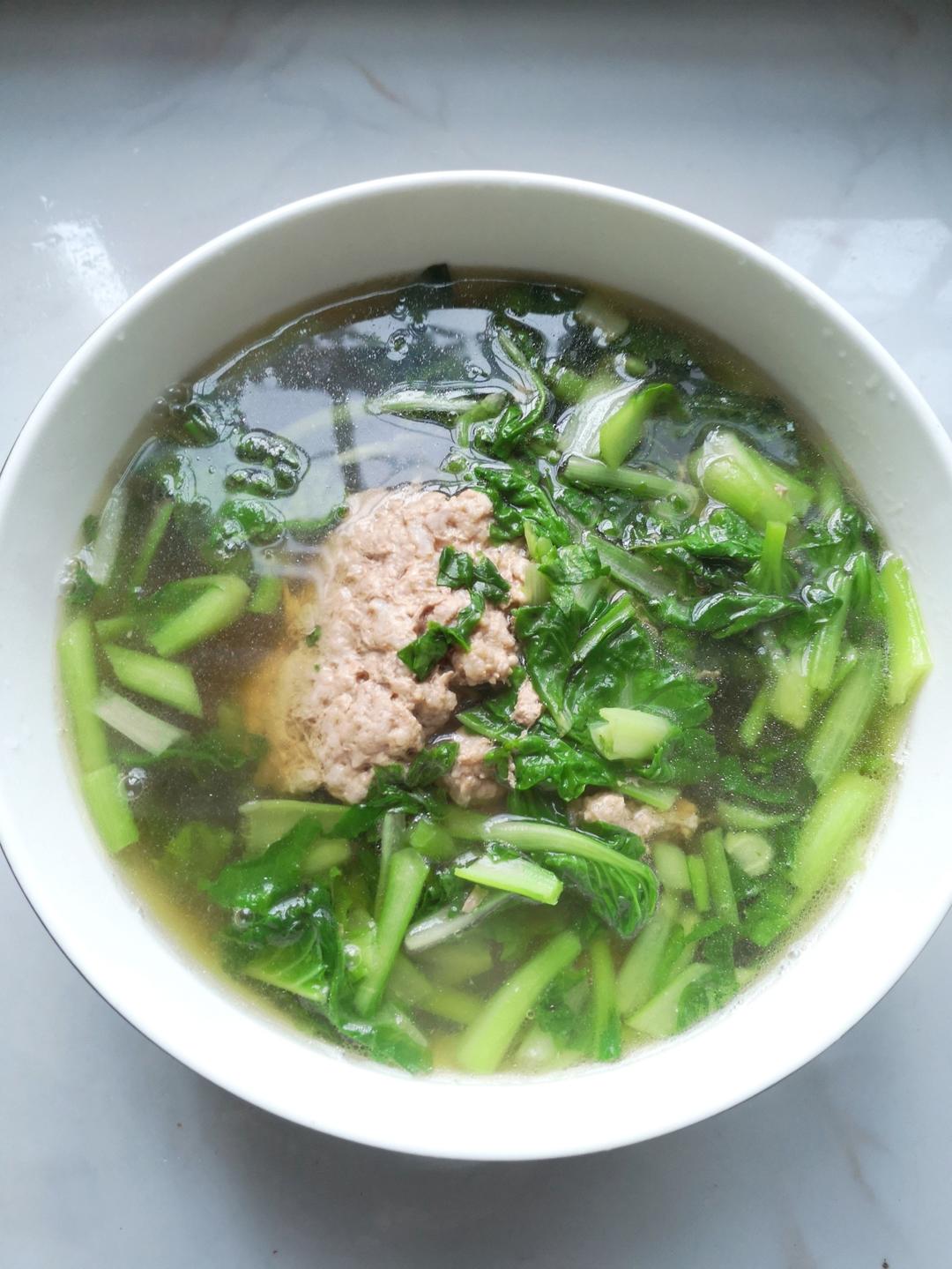 肉饼蒸好了再一把小白菜一烫就是一个鲜美好喝的汤了😂