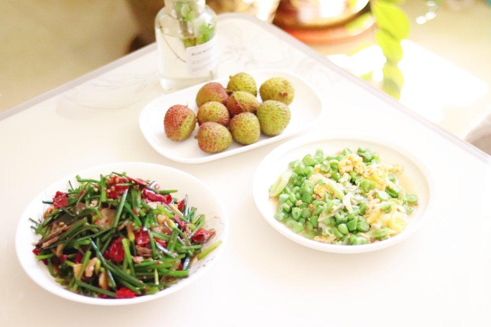 ♥️一人食。素炒豆角米、白灼虾、韭菜香干、苹果醋。本地长豆角用了本...