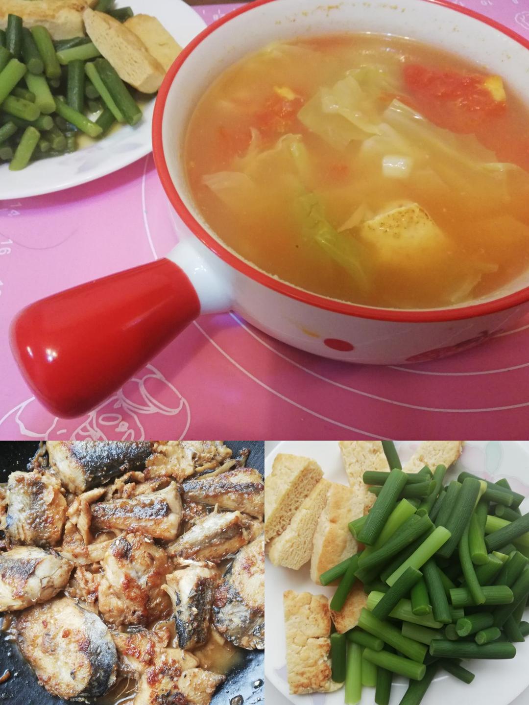 用我可爱的小碗做了蔬菜汤,无油圆白菜西红柿🍅豆干,煎鲅鱼。还有贵妃芒果😍