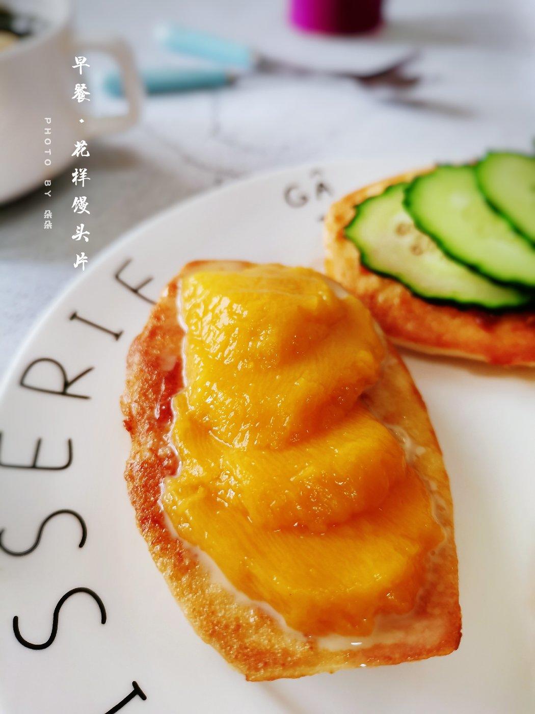 馒头片裹上蛋液,煎至两面金黄,抹上一层炼乳,放几片芒果,很好吃😍