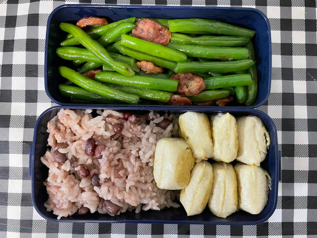 腊肠四季豆、煎石屏豆腐、红豆白米饭