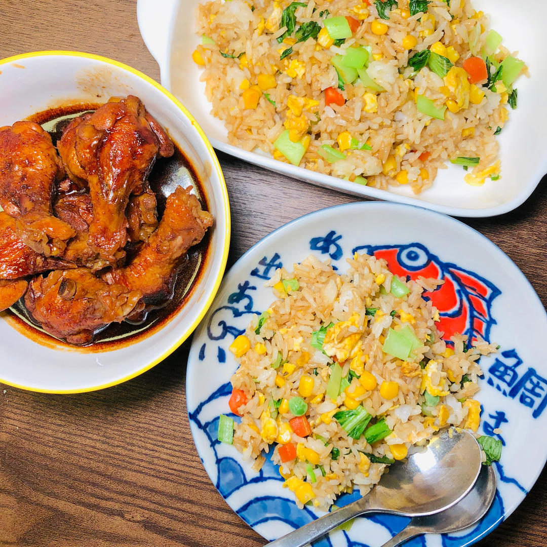 糖醋鸡翅根,鸡蛋杂蔬炒饭。