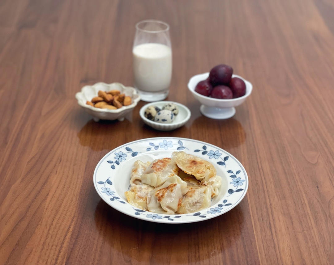 煎饺、鹌鹑蛋、巴旦木、西梅、牛奶