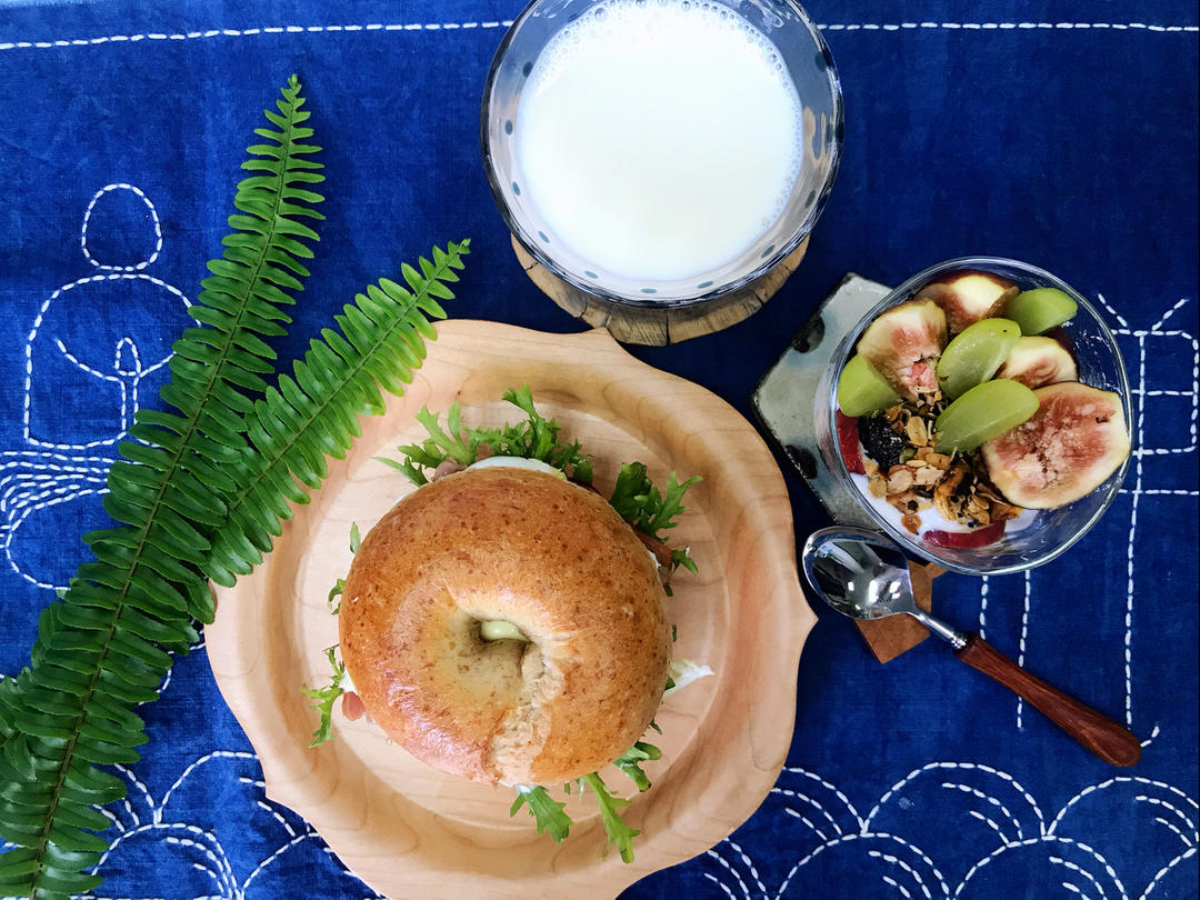 eat a rainbow 吃出一道彩虹🌈是日早餐:盐渍萝卜青瓜鸡蛋培根奶酪生菜全麦贝果 / 无花果黑芝麻椰片酸奶杯 ...