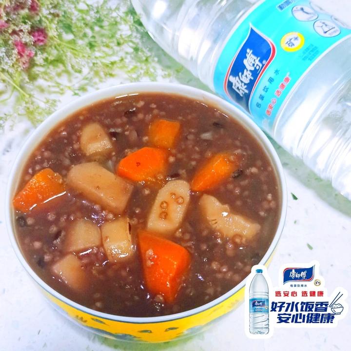 好水煮好粥,黑米、糯小米、胡萝卜、马蹄粥 用康师傅饮用水软水炖煮鲜香更入味! #晚餐•2...