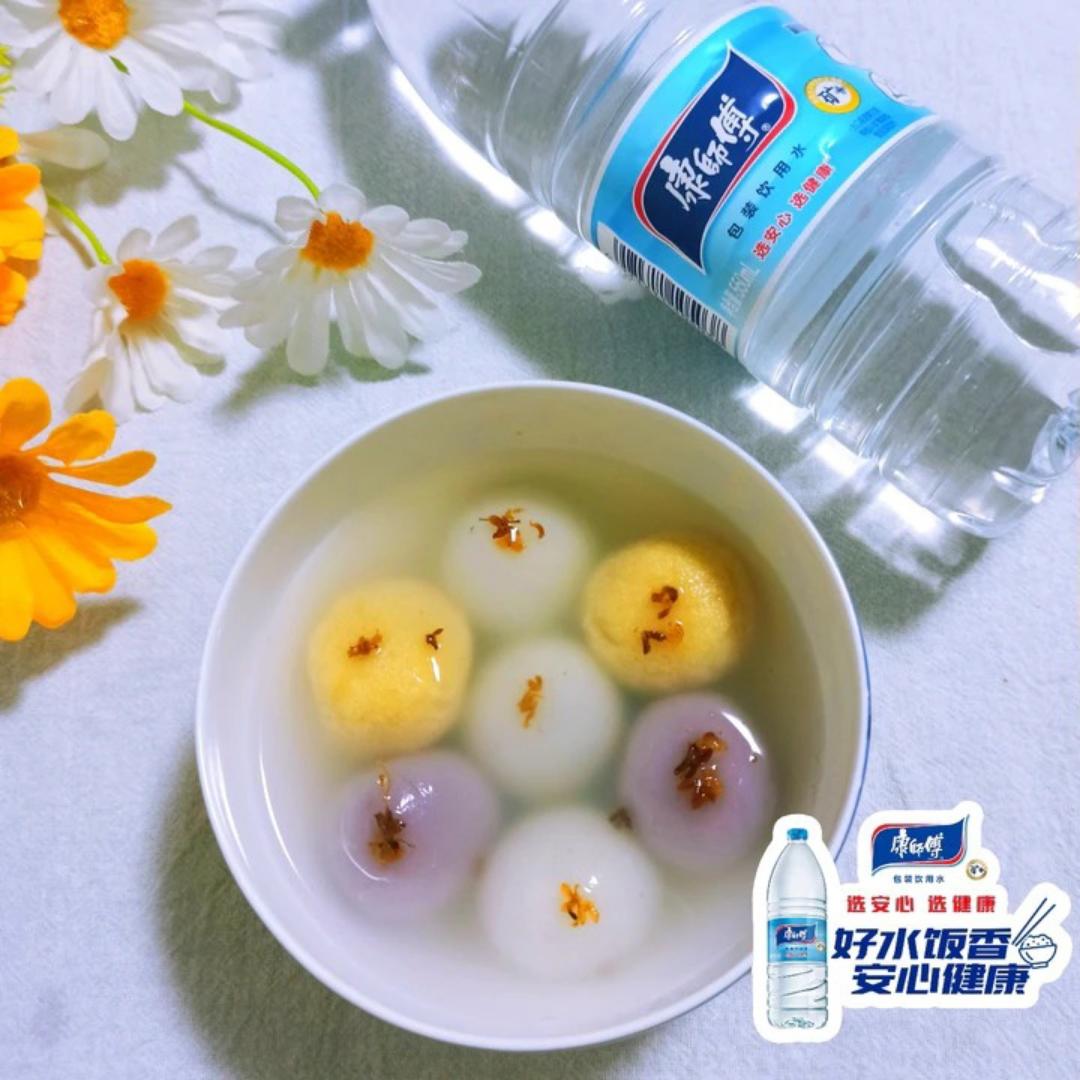 三色桂花汤圆,用康师傅饮用水,软水炖煮鲜香更加入味!
