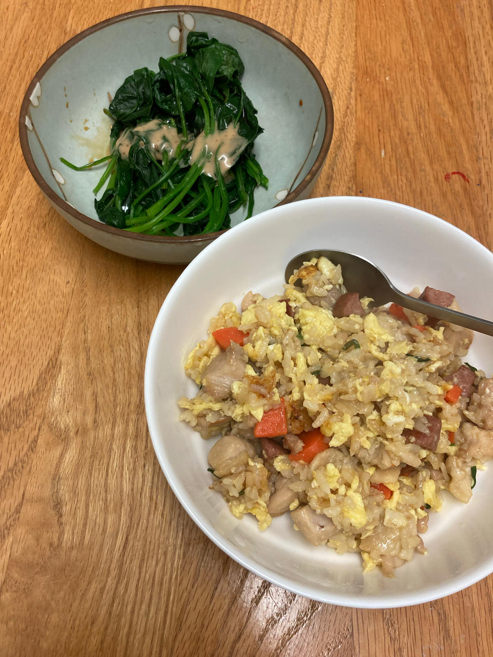 日式芝麻酱拌菠菜+鸡腿肉火腿胡萝卜炒饭