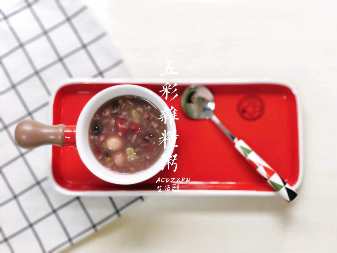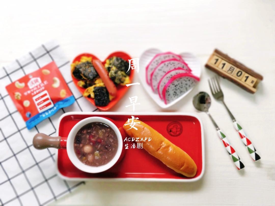 今日早餐:五彩杂粮粥+紫菜炒蛋+早餐包+火龙果+坚果