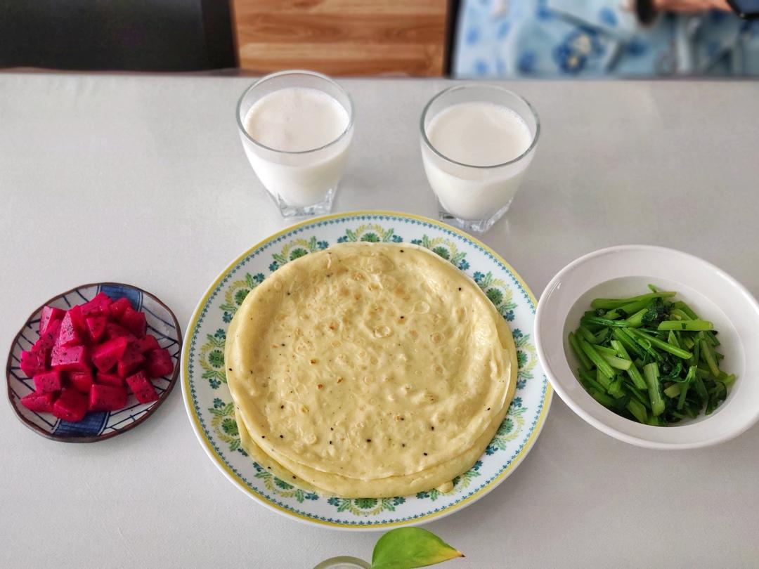鸡蛋饼、炒芹菜、牛奶、火龙果。