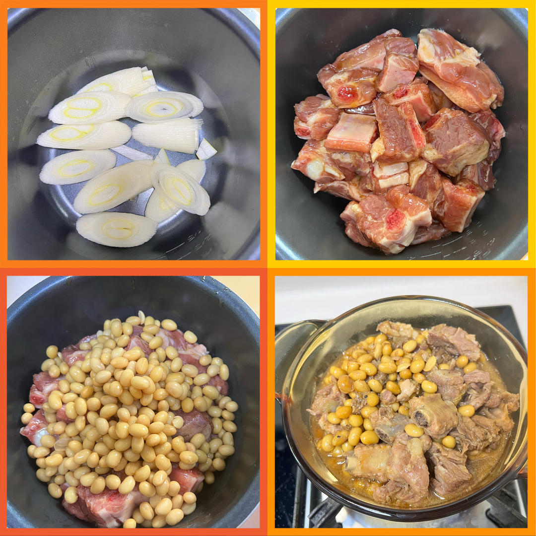 电压力锅大葱铺底+韩式烤肉酱腌制过的排骨+泡软的黄豆