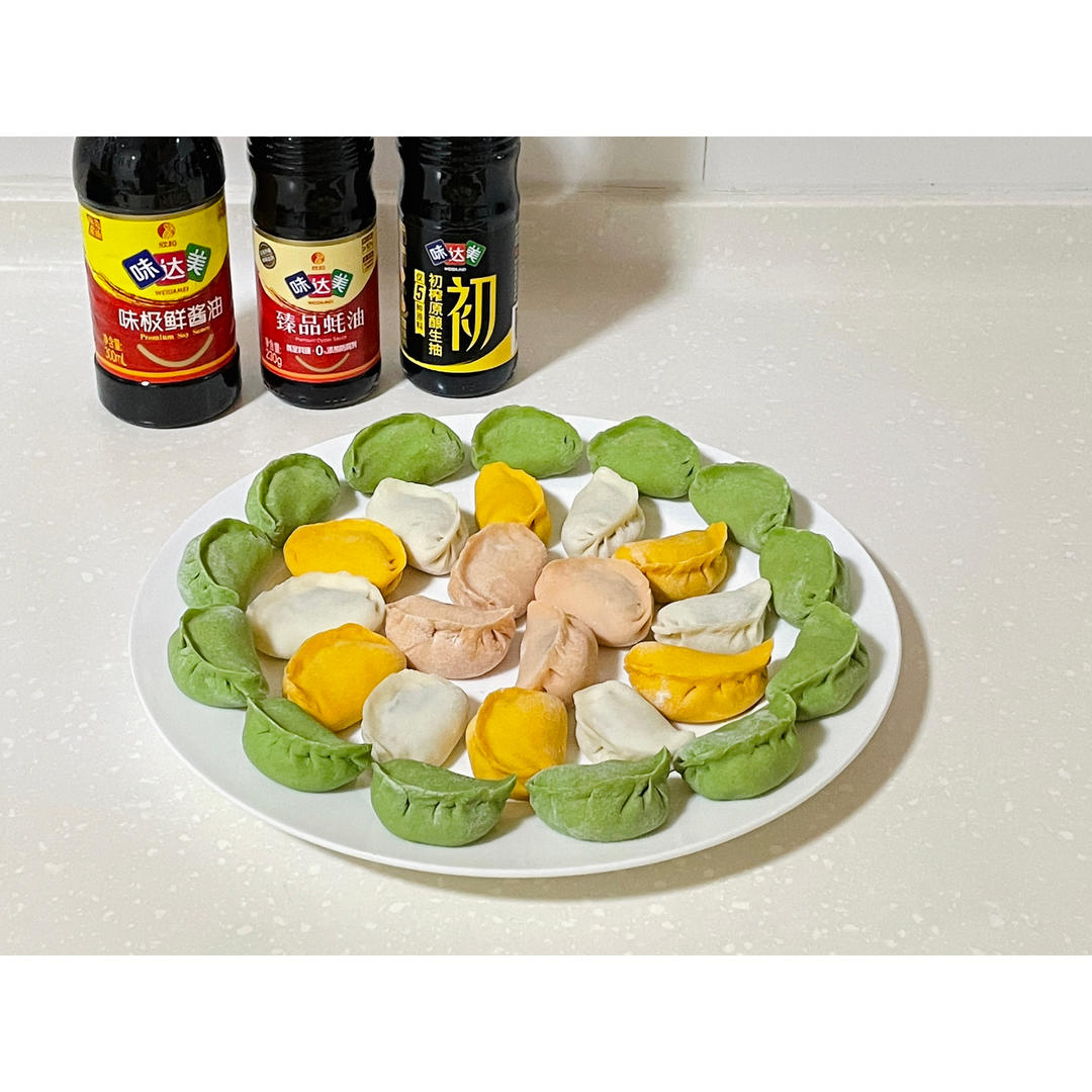 前几天包的彩色饺子,一直没时间整理照片,先记录下来。菠菜焯水后榨汁,红萝卜直接榨汁,南瓜蒸熟后压成泥,各取100克分别加...