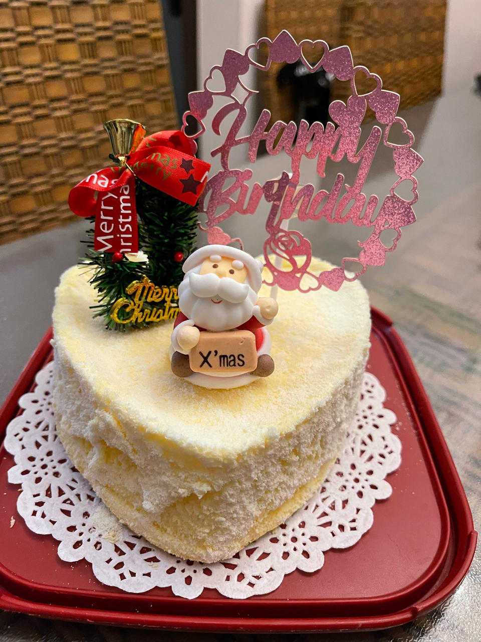 12.24平安夜+庆生,心形轻乳酪蛋糕是自己做的,插了几个小装饰很应景