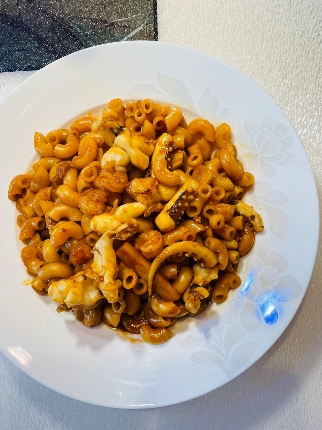 🥣虾仁🍤鱿鱼🦑意面🍝、凉拌黄瓜🥒、炒茼蒿🥬