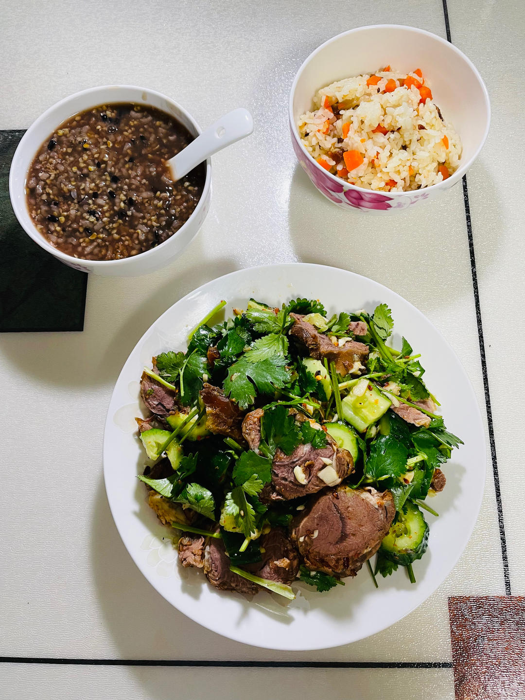 🥣酱牛肉拌黄瓜🥒,我的杂粮粥,姑娘的腊肉胡萝卜🥕焖饭🍚