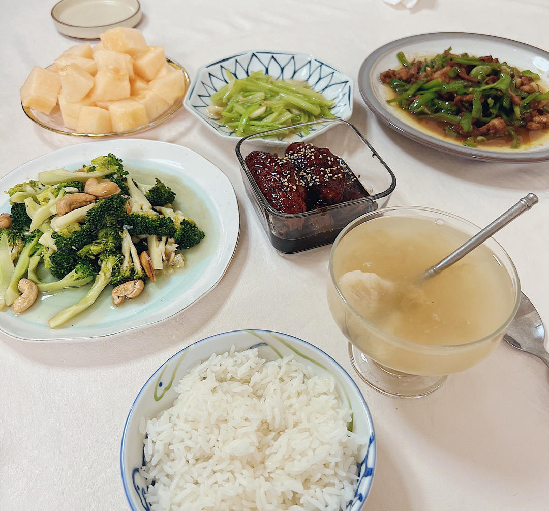 可乐鸡翅➕尖椒肉丝➕腰果西兰花➕炒芹菜➕哈密瓜