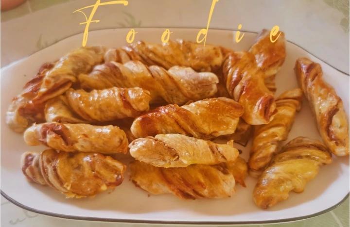 用手抓饼铺上红豆沙,然后扭成螺旋状烤出的小点心,简单易做,酥香可口。