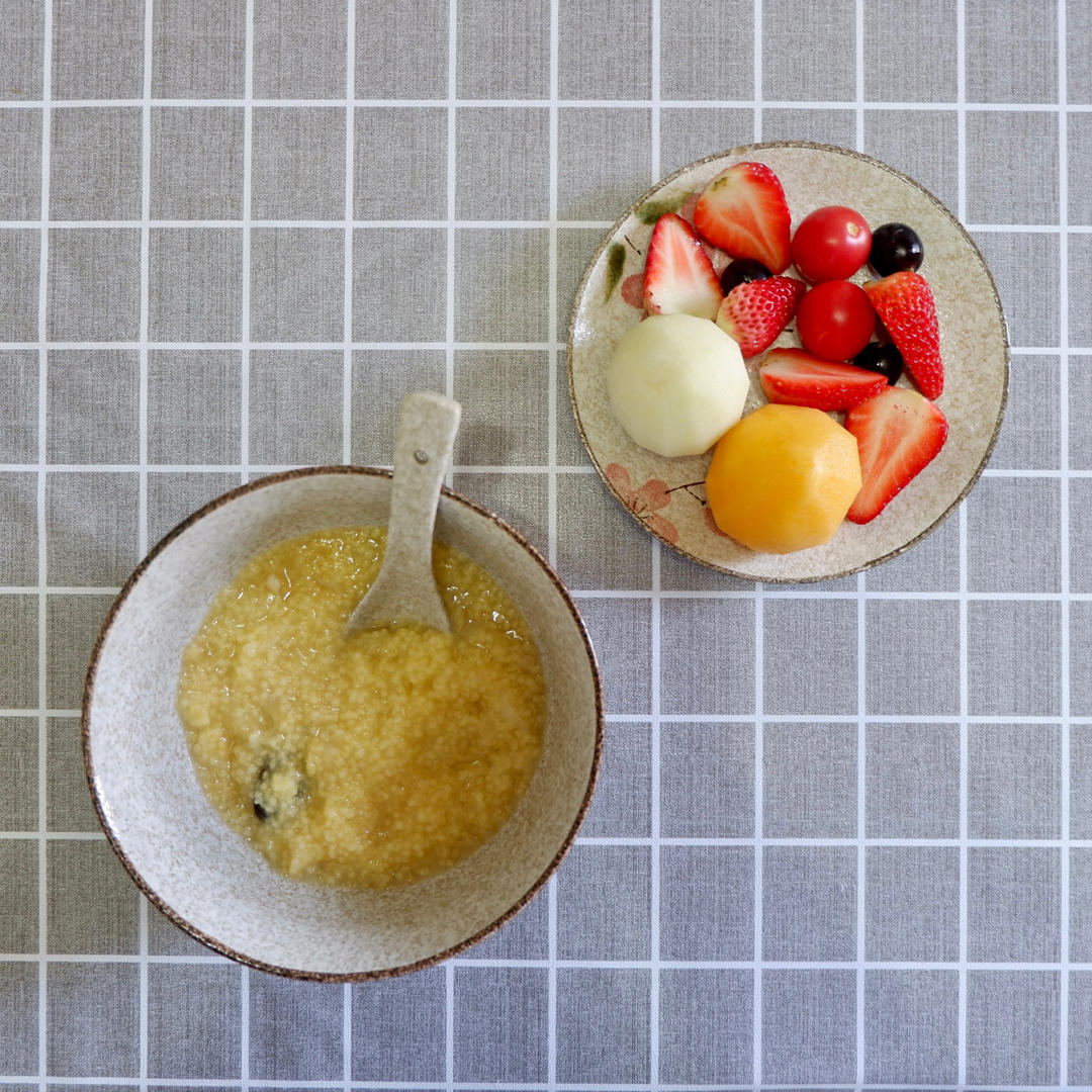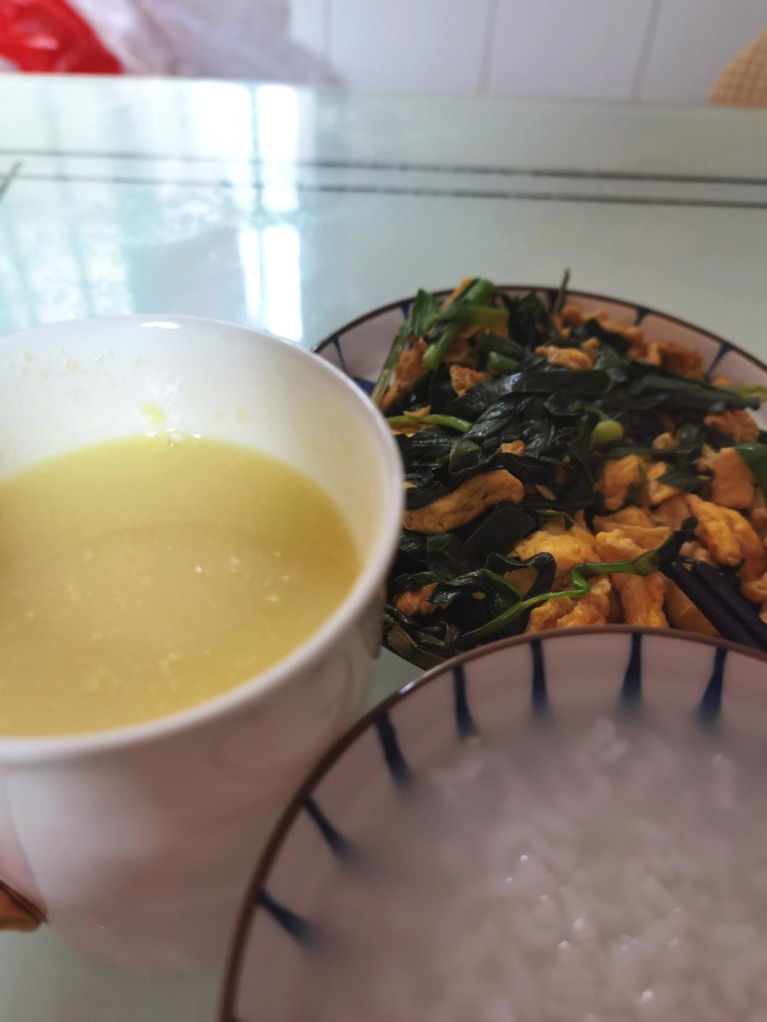 今天的早餐,玉米汁配粥配韭菜炒蛋