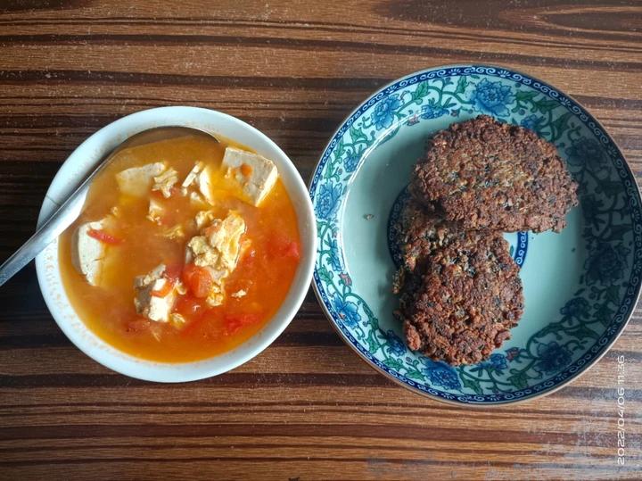 番茄鸡蛋豆腐汤➕黑麦牛奶鸡蛋饼