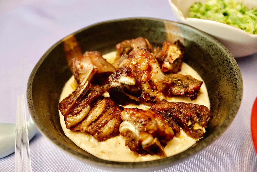 综合香料烤羊切排配奶香豌豆泥。