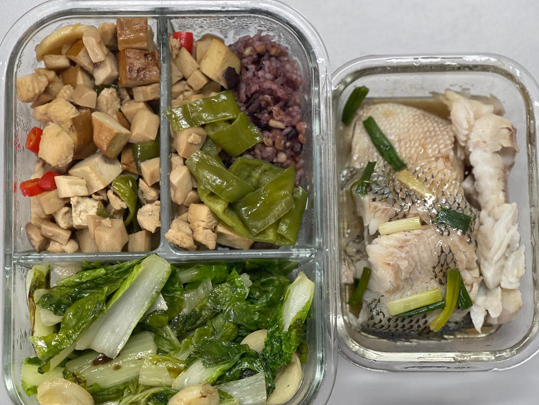 青椒杏鲍菇丁➕清蒸鲈鱼➕炒小白菜➕糙米饭