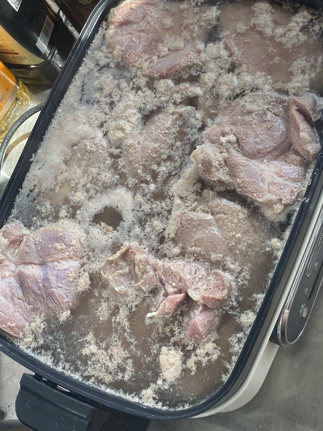 步骤一鹿腿肉改刀,冷水黄酒...
