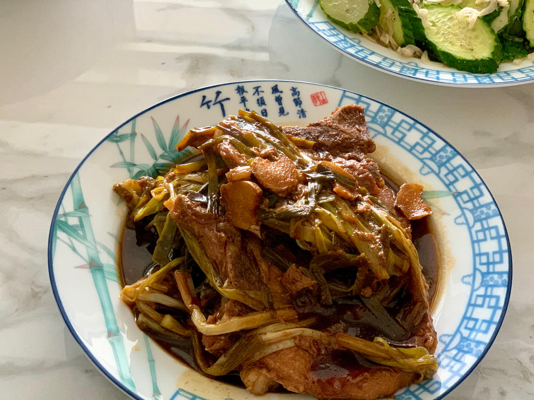 保供菜发来四块大排,午饭做了道糖醋的葱烤大排,味道太嗲了,汤汁全部喝掉。蔬菜做了道黄瓜炒虾皮,补补钙。外加一道凉拌鸡毛菜...