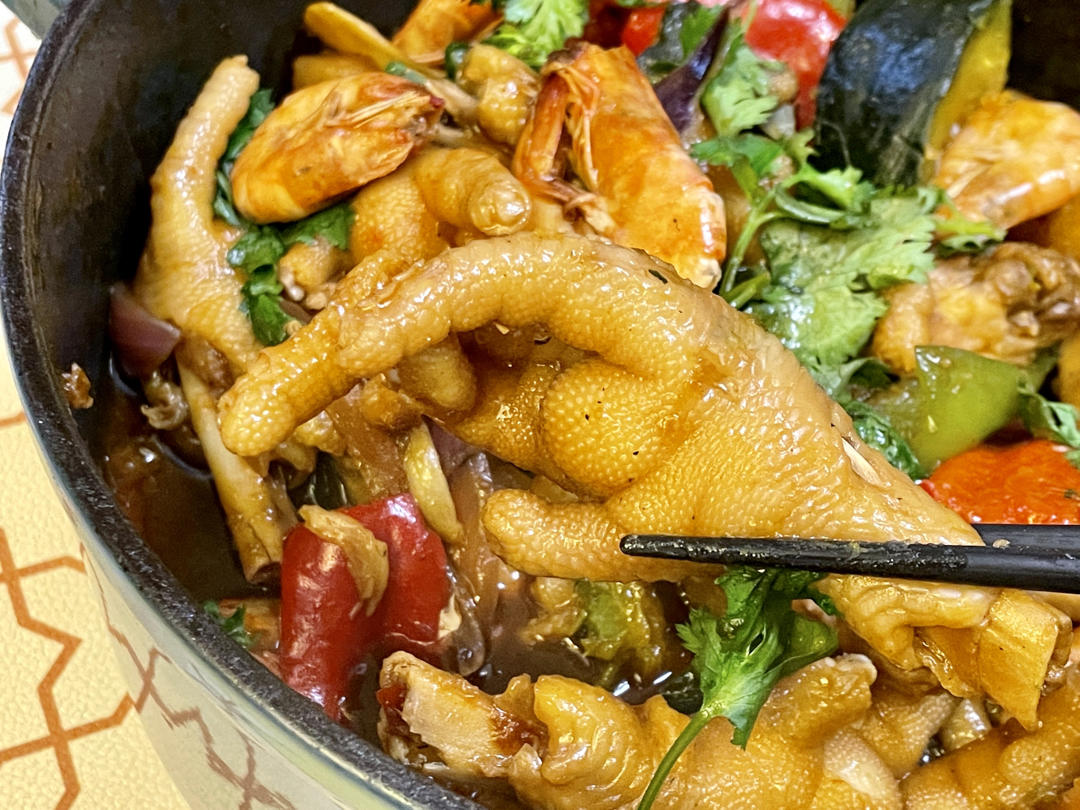 自己改良的焖锅灵魂料汁:2勺料酒+2勺生抽+2勺老抽+2勺蚝油+2勺鲍鱼汁+1勺微辣黄...