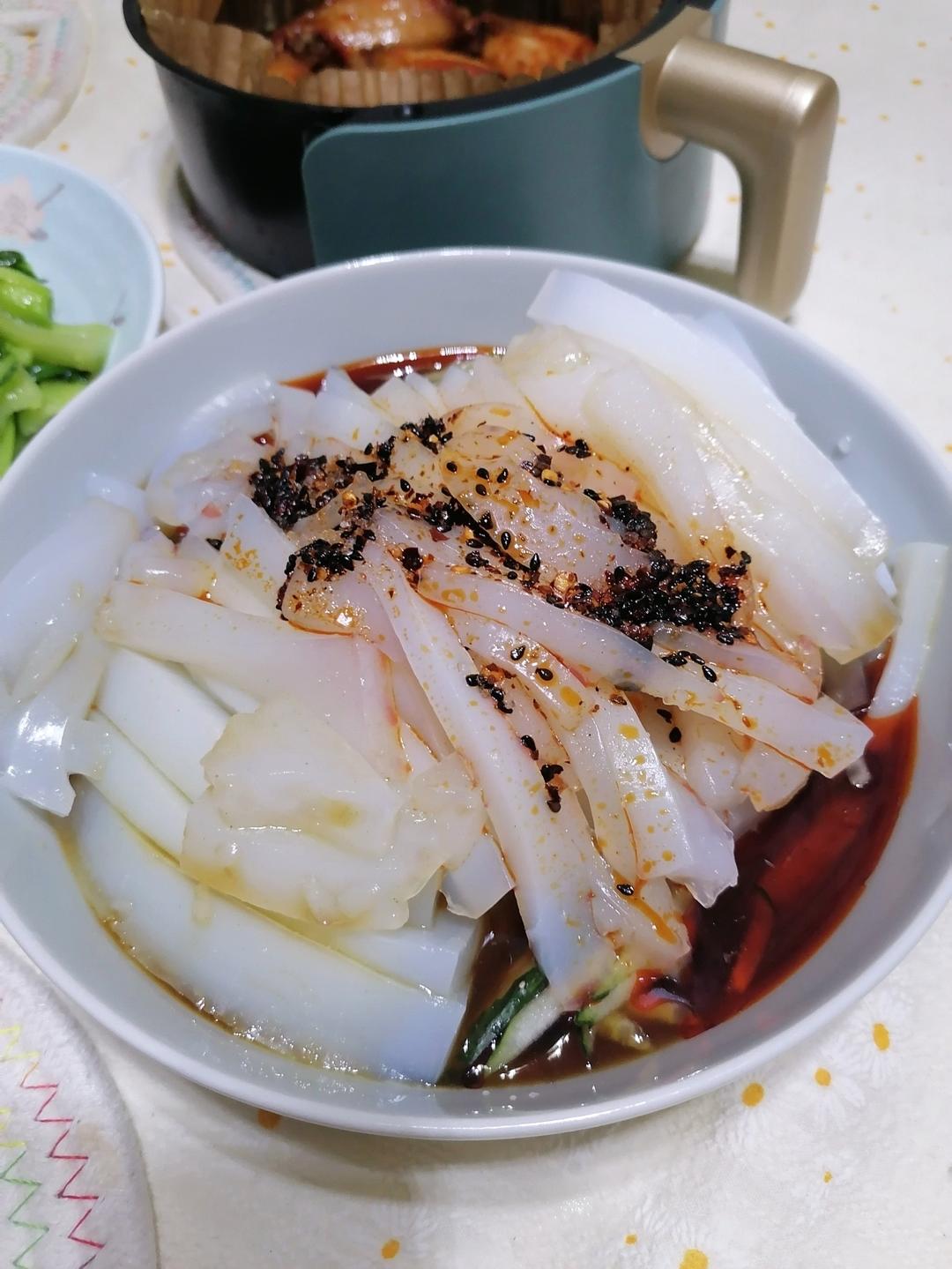 今日晚餐~凉拌凉粉黄瓜丝+空气炸锅烤奥尔良鸡翅+炒青菜。
