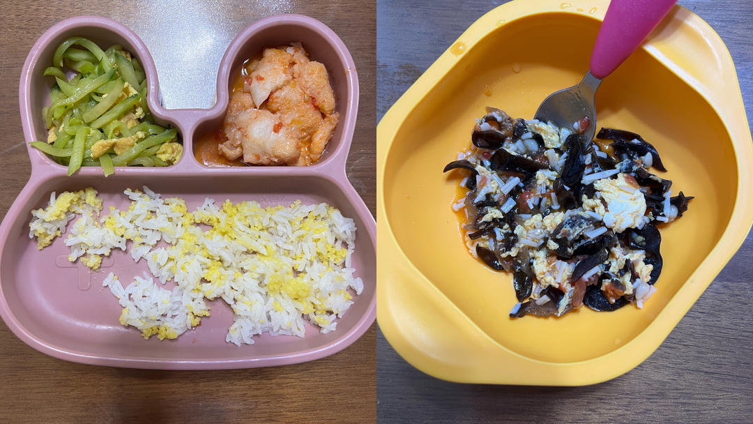 番茄龙利鱼、黄瓜炒鸡蛋、木耳番茄金针菇汤菜、二米饭