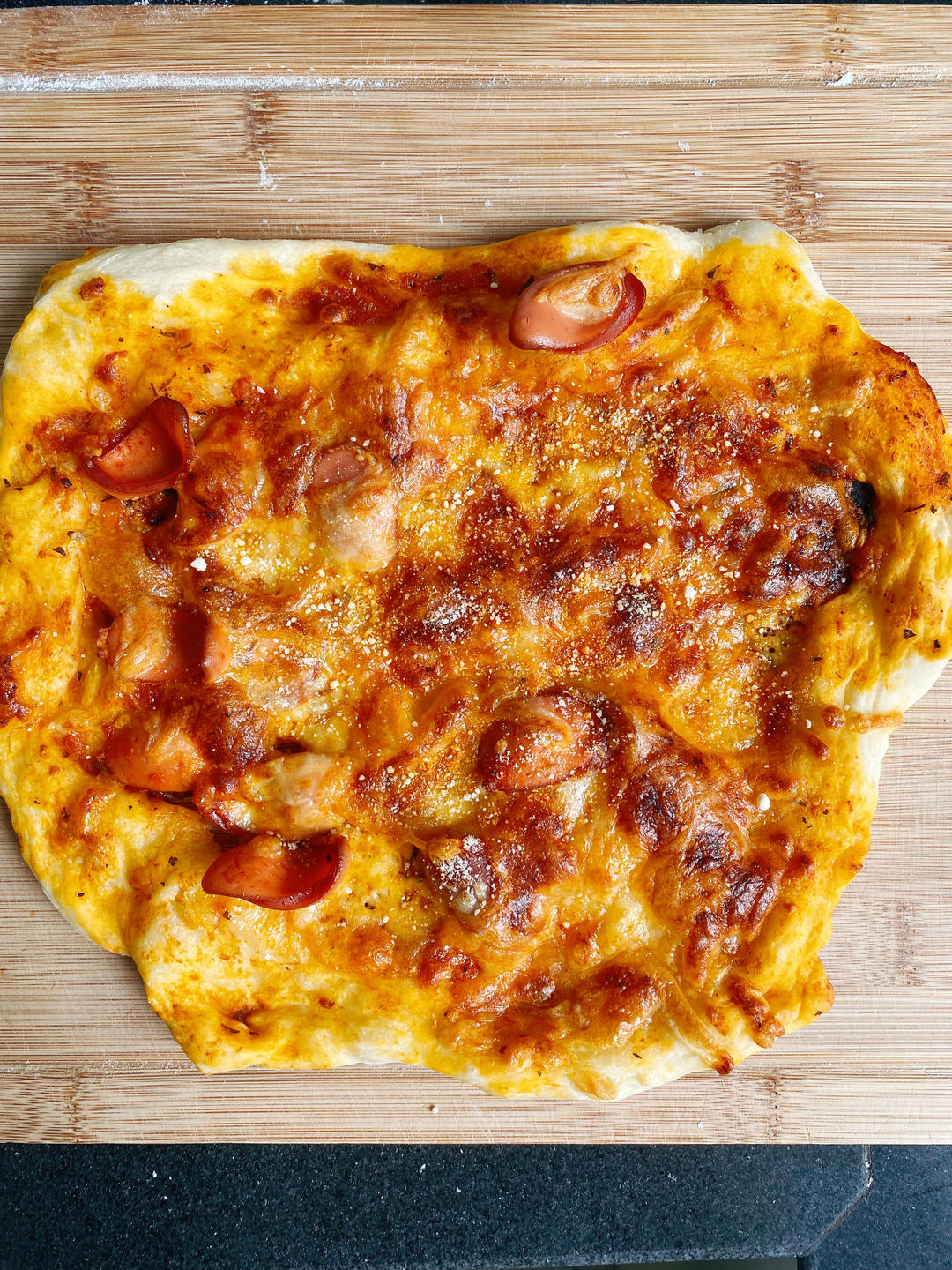 一半的量(250g面粉)做了2个披萨,整形一定垫在油纸上(撒面粉)然后转到烤盘或直接在烤盘...