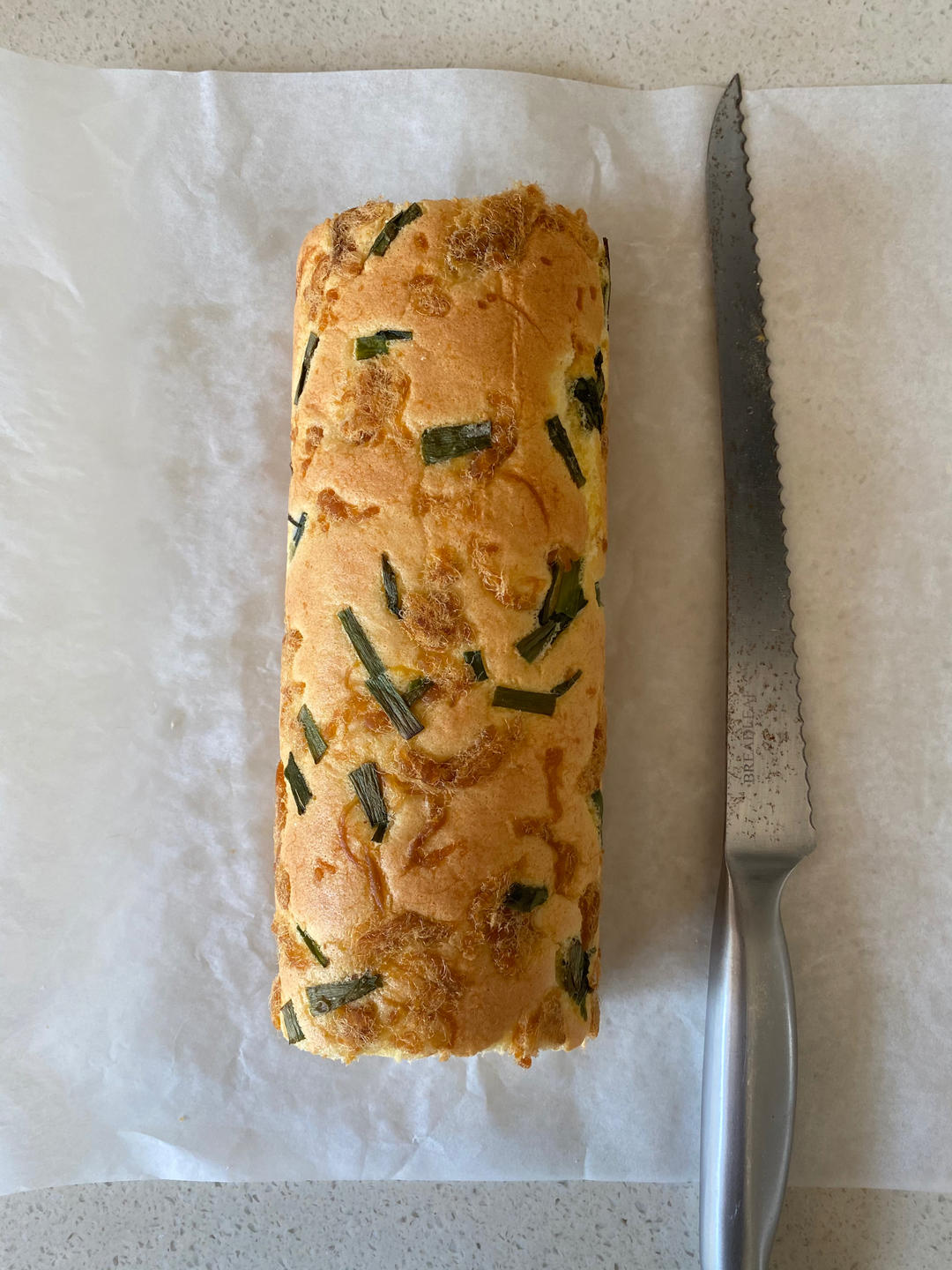 盐3g,糖50g,咸口的……160度22分钟……表面葱和肉松太大太多,造成蛋糕卷有点开裂,下次试试内部再多点肉松