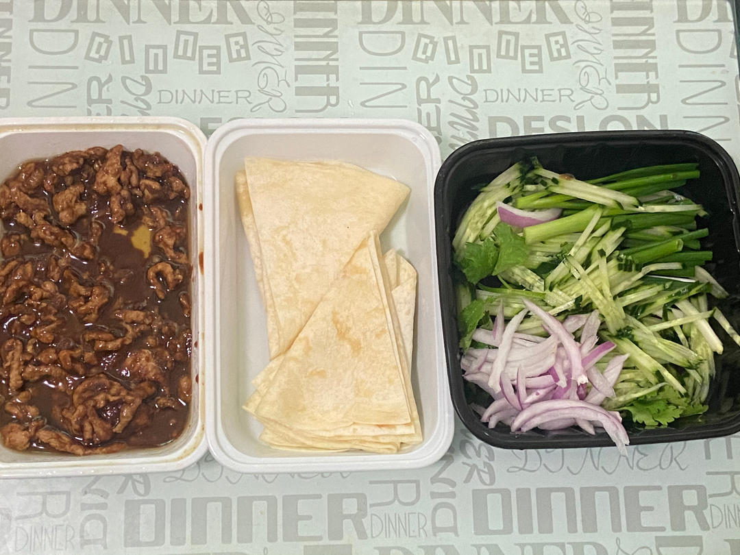 不知为何今天特别想吃卷饼,于是点了份外卖,可惜京酱肉丝的猪肉不够好吃。
