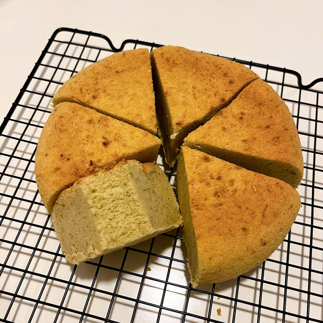 電飯煲版,麵粉增加到80克。因為只有冷藏雞蛋,怕黃油會凝固,用了後蛋法,加了紫菜,還不錯。